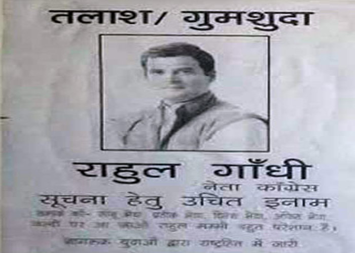 कांग्रेस उपाध्यक्ष राहुल गांधी के छुट्टी पर जाने के बाद अब उनके लापता (गुमशुदा) होने की बात चर्चा का विषय बनी हुई है। उत्तर प्रदेश के बुलंदशहर जिले में राहुल गांधी की गुमशुदगी की तहरीर देने के बाद पोस्टर चस्पा करने का मामला सामने आया है। रविवार को शहर के कई स्थानों पर राहुल गांधी लापता के पोस्टर लगाए गए। साथ ही पोस्टर में तलाश करने वाले को इनाम देने की बात कही गई है।