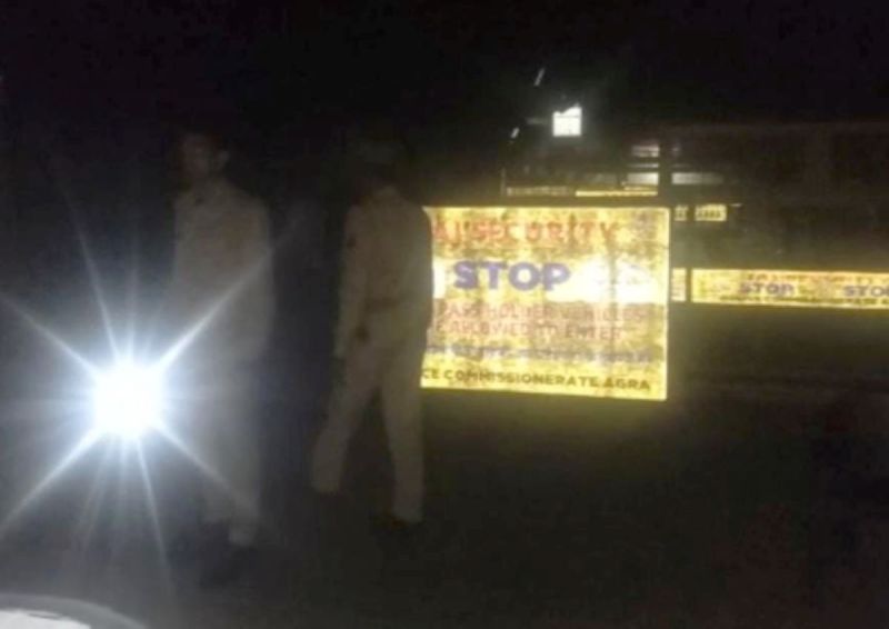 ताजमहल पूर्वी गेट पर टोर्च की रौशनी में चेकिंग करते पुलिसकर्मी