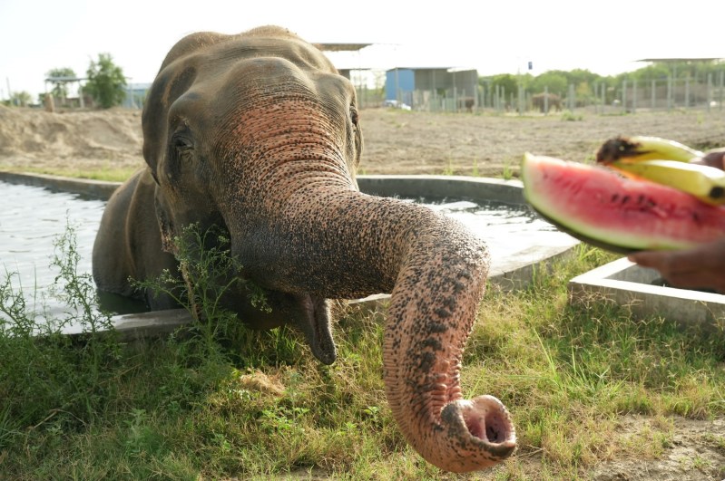 राजू हाथी पूल में स्नान करते हुए तरबूज पसंद करता है
