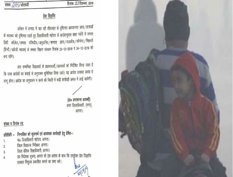 आगरा। ठंड के तेवर देख प्रशासन ने स्कूलों के अवकाश फिर से बढ़ा दिए हैं। अब 25 दिसंबर को सभी स्कूल खुलेंगे। प्रशासन ने कड़ाके की सर्दी को देखते हुए 12वीं तक के सभी स्कूलों को 24 दिसंबर तक बंद करने के आदेश दे दिए हैं। वहीं आने वो दिनों में भीषण कोहरा पड़ने की भी मौसम विभाग ने संभावना व्यक्त की है।