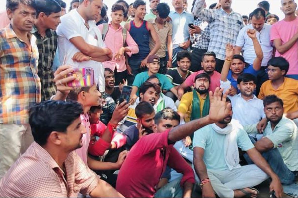 आगरा के बरहन थाने पर दरोगा और उसके सहयोगियों के खिलाफ कार्रवाई की मांग को लेकर जमा हुए ग्रामीण।