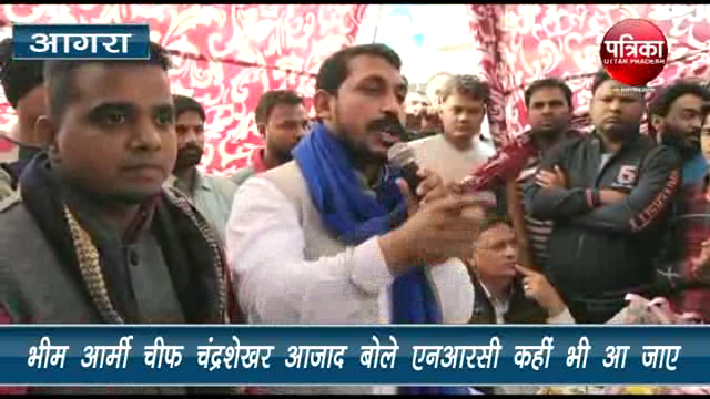 आगरा। भीम आर्मी (Bhim Army) प्रमुख चंद्रशेखर आजाद 'रावण' (Chandrashekhar Ravan) गुरुवार को ताजमहल के शहर आगरा में आए। यहां जगदीशपुरा स्थित अधिवक्ता सुरेश चंद सोनी के आवास पर एक छोटी जनसभा को संबोधित करते हुए उन्होंने कहा कि ये देश सभी का है। एनआरसी असम में हो, या बंगाल में या आगरा में या यूपी में हो जाए। वादा करता हूं, कि एक भी मुस्लिम भाई को देश से जाने नहीं दिया जाएगा। जो भारतीय संविधान के लागू होने के बाद इस मुल्क का है, वो इस मुल्क का है।