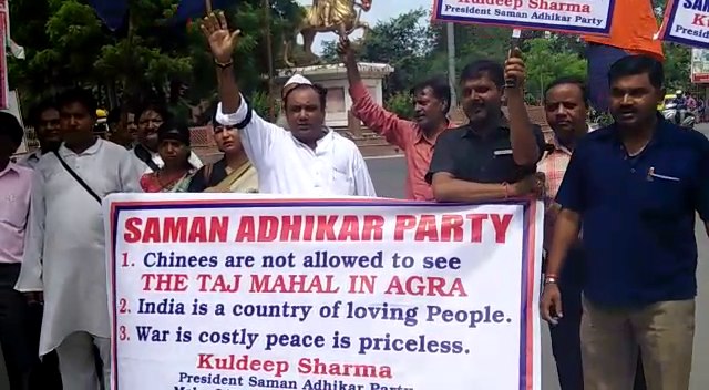 आगरा। चीन की बेवजह और बेईमानी की नीयत तथा लगातार युद्ध की धमकी का जवाब समान अधिकार पार्टी ने विश्व प्रसिद्ध इमारत ताजमहल से दिया। पार्टी के चुनिंदा कार्यकर्ता हाथों में काली पट्टी बांधे चीन के खिलाफ नारे लगा रहे थे। कार्यकर्ता कह रहे थे- चीन नागरिकों को ताजमहल में प्रवेश की अनुमति नहीं है।