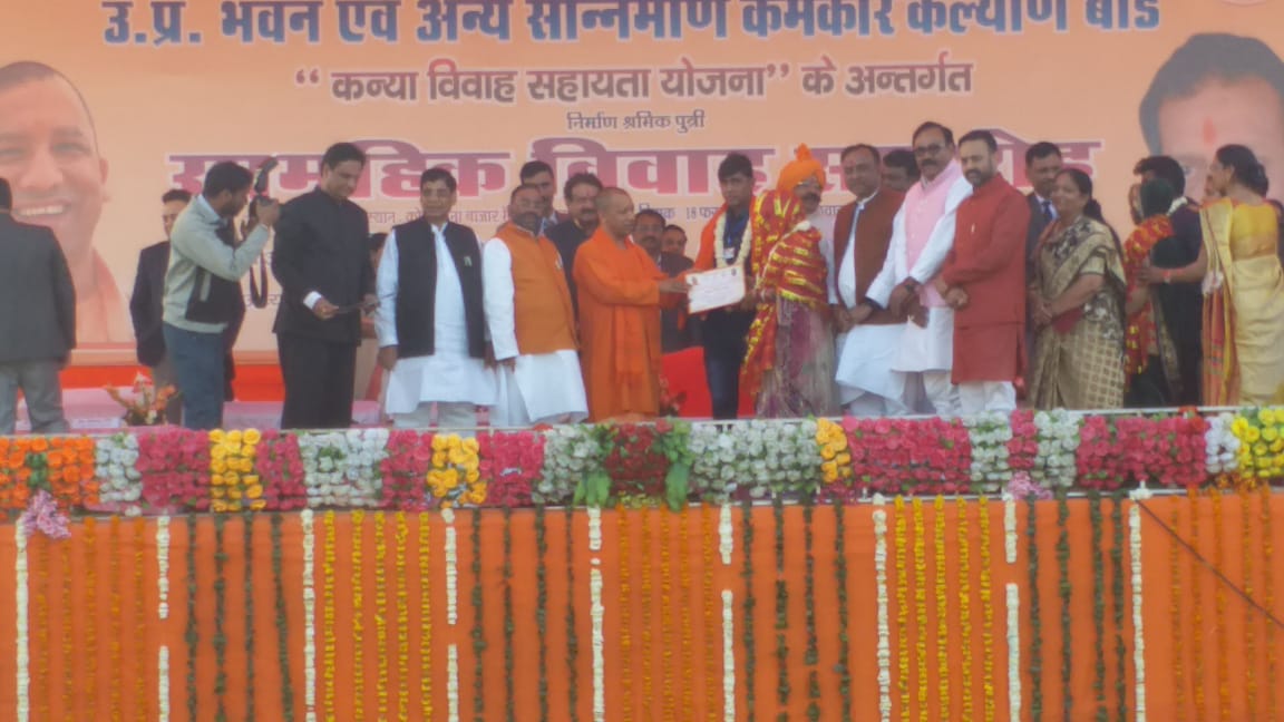 आयोजन के मंच पर मुख्यमंत्री के साथ मंत्री चौधरी उदयभान सिंह, सांसद प्रो एसपी सिंह बघेल, सांसद राजकुमार चाहर, सांसद जीएस धर्मेश और मेयर नवीन जैन मौजूद हैं। अपने भाषण में श्रममंत्री स्वामी प्रसाद मौर्या ने कहा कि जोड़ो को आशीर्वाद देने सीएम खुद आये हैं। श्रमिक पुत्री सामुहिक विवाह में सभी का स्वागत है। समाज के अंतिम पायदान पर खड़े श्रमिकों को 18 योजना चला कर लाभ दे रहे हैं। गरीब को शौचालय, घर, चिकित्सा सब कुछ दे रहे हैं। शादी में 10 हज़ार अतिरिक्त देकर 75 हज़ार दे रहे हैं। श्रमिकों को कोई पूछता नहीं था, उनके लिए अटल आवासीय योजना विद्यालय खुलेंगे। मेयर नवीन जैन ने कहा कि इतने लोगों का विवाह अपने आप में अनोखा आयोजन है। श्रम विभाग ने काफी मेहनत की, सीएम समय दें, तो 2100 जोड़े का विवाह करने को भी हम तैयार हैं।