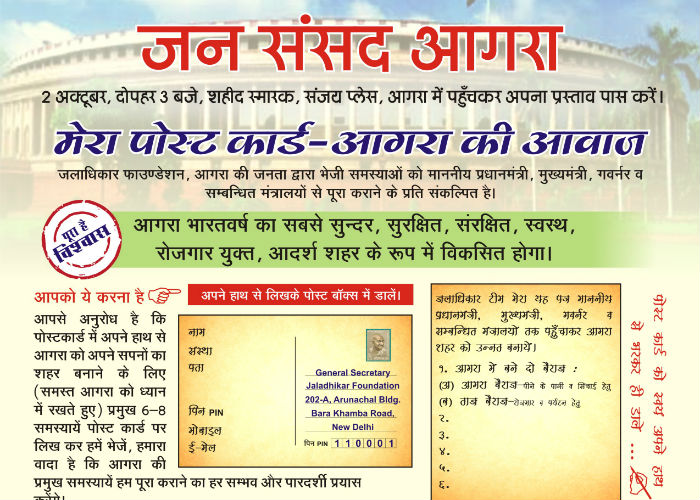 जलाधिकार के राष्ट्रीय सचिव अवधेश कुमार उपाध्याय ने आगरा "जलाधिकार पावर टीम" के साथ कहा कि आगरा को भारत का सबसे सुन्दर शहर बनाने के लिए उनकी टीम लगभग 20 हजार घरों से पोस्टकॉर्ड भेजे जाएंगे। जिसके माध्यम से लिखित में प्रमुख छह से आठ समस्याओं को लिया जाएगा। इसके बाद उनके सकारात्मक समाधान के लिए प्रधानमंत्री, मुख्यमंत्री और अन्य मंत्रालयों से समाधान कराने के भरकस प्रयास किए जाएंगे। आगरा के लगभग एक लाख लोगों को आगरा की मुख्य समस्याओं के बारे में सोचने को विवश कर चिन्तन की ओर ले जा सकेगी।