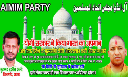 सांसद असदुद्दीन ओवैसी की पार्टी है एआईएमआईएम (ऑल इंडिया मजलिस-ए- इत्तेहादुल मुसलमीन)। आगरा में एआईएमआईएम के जिलाध्यक्ष हैं इदरीस अली। उन्होंने शनिवार की सुबह एक कलक्ट्रेट के ठीक सामने एक होर्डिंग लगवाया। इस पर लिखा था- योगी सरकार ने किया भारत का अपमान। उत्तर प्रदेश के मुख्यमंत्री योगी आदित्यनाथ कभी आगरा न आएं। विश्व में भारत की एक पहचान ताजमहल भी है। जो सरकार ताजमहल के साथ नहीं है, वो भारत के साथ नहीं है। पर्यटन बुक से ताजमहल का नाम हटाकर योगी सरकार ने संपूर्ण विश्व में किया भारत का अपमान। जो किसी भी सूरते हाल में बर्दाश्त नहीं। इसे लेकर जल्द ही एक विशाल जन आंदोलन होगा। होर्डिंग पर एक ओर इदरीस अली की फोटो लगी है तो दूसरी ओर मुख्यमंत्री योगी आदित्यनाथ की।