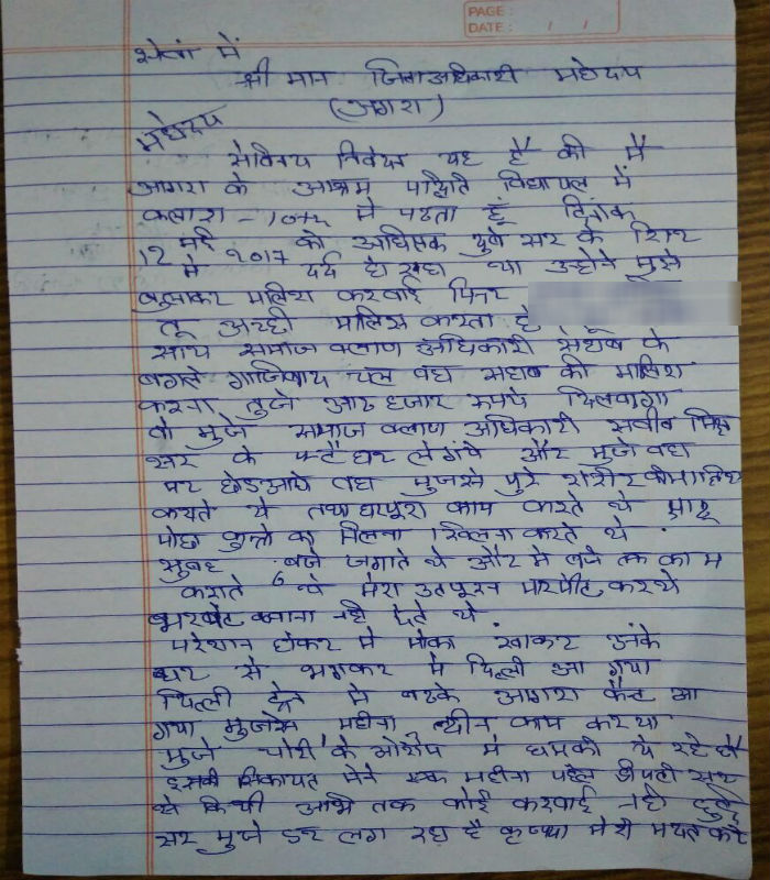 सैंया ब्लॉक में सिकंदरपुर गांव है सिंकदरपुर का रहने वाला अंकित (बदला हुआ नाम) राजकीय स्वच्छकार आश्रम पद्धति विद्यालय इटौरा में कक्षा दसवीं का छात्र हैं। यहां के अधीक्षक राकेश दुबे हैं। छात्र का आरोप है कि राकेश दुबे बच्चे से अपनी मालिश करवाते थे। इसके पिता नाई का काम करते हैं जिसके चलते छात्र अच्छी मालिश कर लेता है, ऐसा अधीक्षक उससे कहते थे। उन्होंने कहा कि साहब की मालिश कर लेगा, तो प्रमोशन हो जाएगा। ऐसा लालच देकर उसे समाज कल्याण अधिकारी आगरा के गाजियाबाद फ्लैट पर भेज दिया गया। समाज कल्याण अधिकारी का नाम संजीव नयन मिश्र बताया गया है, जो आगरा में तैनात हैं। राकेश बच्चे को गाजियाबाद फ्लैट पर ले गए और वहां उसे छोड़कर चले आए। फ्लैट पर घर का पूरा काम करवाते रहे। मालिश भी करवाई गई और घर का खाना बनवाना और कुत्ते को नहलवाना और कुत्ते की कंघी करवाई गई। पेट भरके खाना भी नहीं देते थे। बच्चे को लालच दिया गया था कि मालिश करेगा, तो उसे करीब आठ हजार रुपये दिलवाए जाएंगे। बच्चे को पैसे भी नहीं मिले। बच्चे का कहना है कि सुबह छह बजे उसे जगाकर रात को एक बजे तक काम कराया जाता था। एक महीने तीन दिन तक काम किया। एक दिन कचरा फेंकने के दौरान जब घर से निकला तो बच्चा एक आॅटो में बैठकर रेलवे स्टेशन पर पहुंचा और ट्रेन में बैठकर आगरा आया। यहां ट्रेन में बच्चे को पकड़ा तो स्कूल का कार्ड दिखाकर घर पहुंच गया। परिवार को बात बताई और स्कूल में शिकायत की, लेकिन कोई कार्रवाई नहीं हुई। उपनिदेशक समाज कल्याण विभाग निरीक्षण करने गए थे, उनसे बच्चे ने शिकायत की। लेकिन फिर भी कोई कार्रवाई नहीं हुई। बच्चे ने डीएम को लेटर लिखा और कलेक्ट्रेट भेजा। एडीएम सिटी से मुलाकात कराई। उन्होंने जांच का आश्वासन दिया है। महफूज के पश्चिमी उत्तर प्रदेश कोआॅर्डिनेटर नरेश पारस ने बताया कि मामला राष्ट्रीय बाल अधिकार संरक्षण आयोग, मुख्यमंत्री जनसुनवाई पोर्टल पर मामला भेजा है।