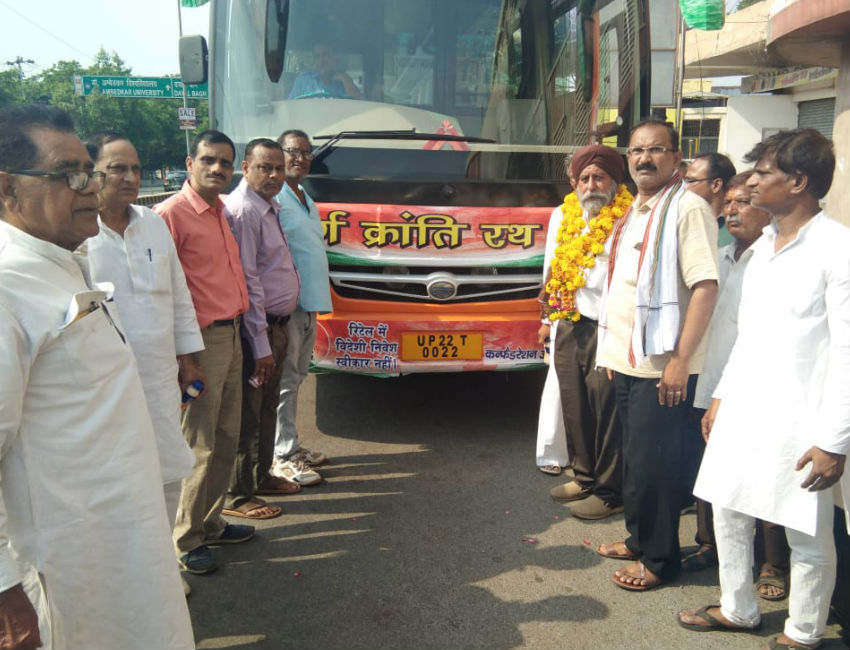 आगरा। एफडीआई विदेशी रिटेल व्यापार के विरोध में चल रही रथयात्रा का आगरा में जोरदार स्वागत हुआ। रथयात्रा के माध्यम से बताया गया कि एफडीआई की वजह से धीरे-धीरे खत्म होता जा रहा है जिस कारण समाज में बेरोजगारी बढ़ रही है।