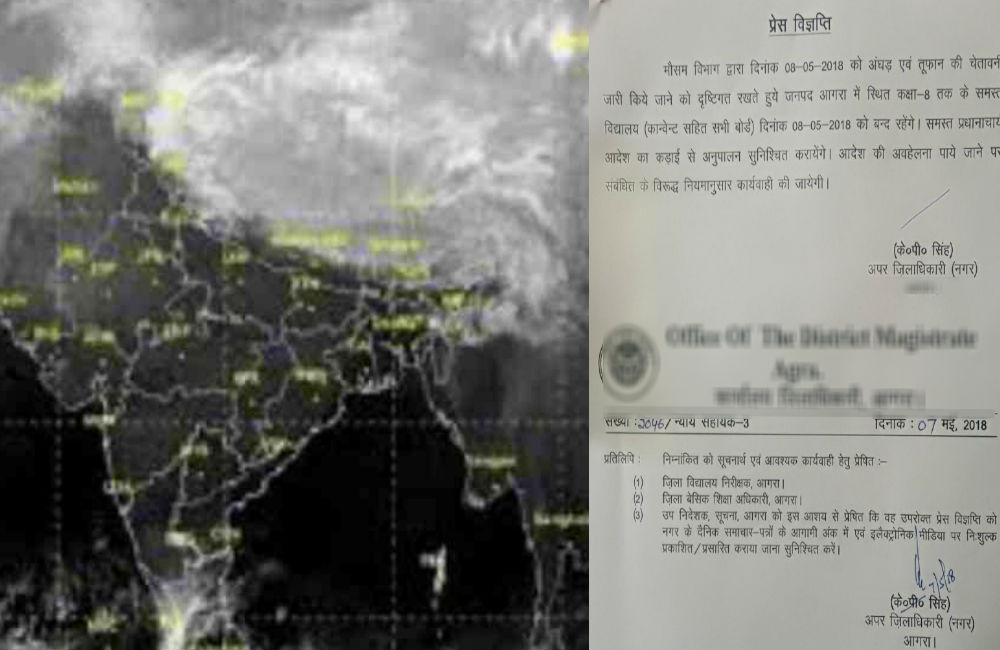 अपर जिलाधिकारी केपी सिंह ने विज्ञप्ति जारी करते हुए कहा है कि मौसम विभाग द्वारा 8 मई को अंधड़ एवं तूफान की चेतावनी जारी की है, जिसके दृष्टिगत आगरा में स्थित कक्षा 8 तक के सभी विद्यालय कान्वेंट सहित सभी बोर्ड के स्कूल 8 मई को बंद रहेंगे। उन्होंने सभी प्रधानाचार्य को आदेश का कड़ाई से अनुपालन करने के लिए कहा है। साथ ही कहा गया है कि आदेश की अवहेलना करने पर संबंधित के विरुद्ध नियमानुसार कार्रवाई की जाएगी।