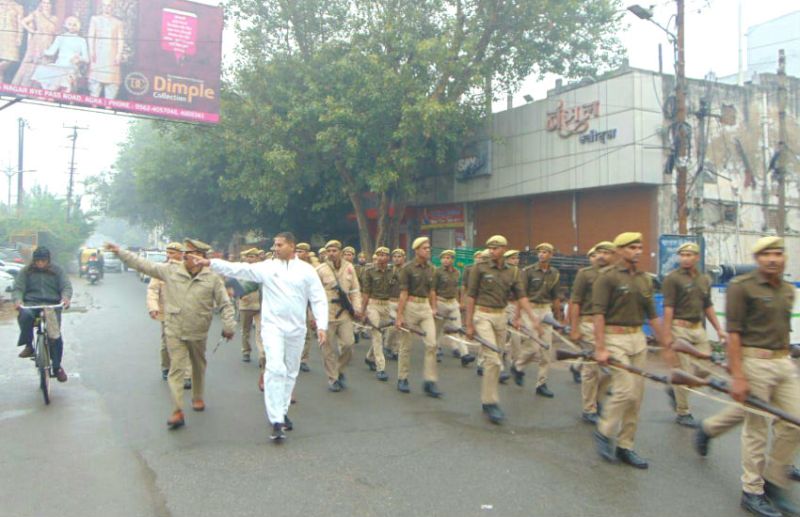 आगरा। वरिष्ठ पुलिस अधीक्षक बबलू कुमार (SSP agra bablu kumar) ने प्रातःकाल रिमझिम बारिश (Rain) के बीच फुटमार्च (Foot march) किया। भारी पुलिस बल (Police force) के साथ संवेदनशील इलाकों में पैदल घूमे। इस दौरान ड्यूटी पर तैनात पुलिस कर्मचारियों की चेकिंग भी की।