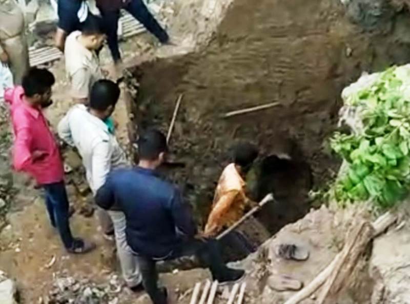 मिट्टी में दबे मजदूर को निकालने को राहत कार्य करते लोग