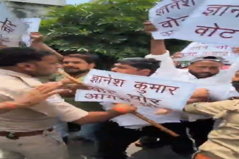 कांग्रेस कार्यकर्ताओं ने भाजपा और चुनाव आयोग पर कथित वोट चोरी का विरोध किया। हालांकि, पुलिस ने हल्का बल प्रयोग करते हुए प्रदर्शनकारियों को घर से लगभग 100 मीटर पहले ही रोक दिया।