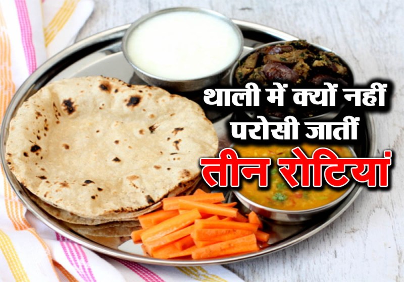 हिंदू रीति रिवाजों के अनुसार तीन रोटियां एक साथ थाली में नहीं परोसी जाती हैं। किसी को खाना देते समय भी ये ध्यान रखा जाता है कि तीन रोटियां न दी जायें। रोटियों की संख्या या तो दो हो या फिर चार लेकिन तीन नहीं होनी चाहिए। इसे अशुभ माना जाता है। यही कारण है कि जरूरत पड़ने पर यदि किसी को थाली में तीन रोटियां साथ रखनी भी पड़ जाए तो वे एक रोटी को दो भागों में बांटकर रखते हैं, ऐसा करने से इन रोटियों की संख्या तीन के बजाय चार मानी जाती है। ज्योतिषाचार्य विवेक शास्त्री से जानते हैं कि इस मान्यता के पीछे आखिर क्या आधार है।