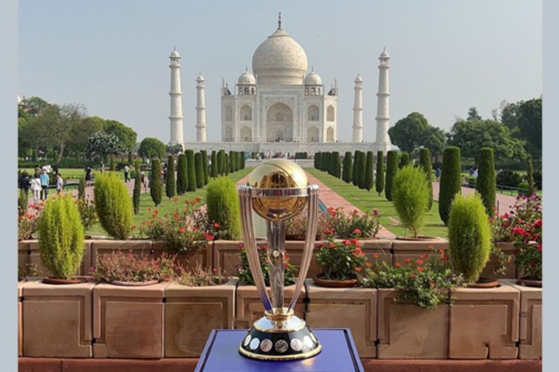ताजमहल के सामने रखकर आईसीसी क्रिकेट विश्व कप की ट्रॉफी का फोटोशूट किया गया।