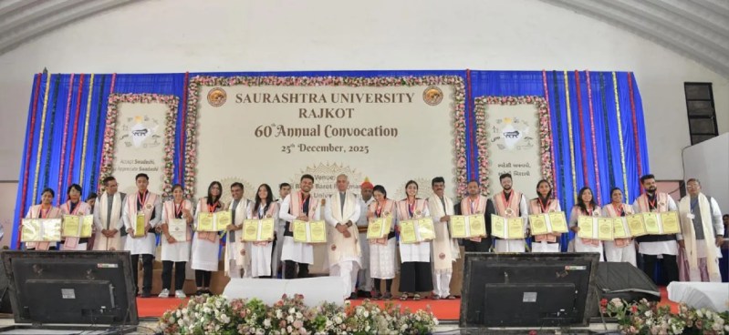 राजकोट. राज्यपाल आचार्य देवव्रत की अध्यक्षता और उच्च शिक्षा मंत्री डॉ. प्रद्युम्न वाजा की उपस्थिति में गुरुवार को सौराष्ट्र यूनिवर्सिटी का 60वां दीक्षांत समारोह आयोजित हुआ। स्वदेशी अपनाओ, स्वदेशी बढ़ाओ की थीम के साथ आयोजित समारोह में 14 विद्या शाखाओं के 160 विद्यार्थियों को कुल 178 गोल्ड मेडल प्रदान किए गए। 186 विद्यार्थियों को 271 पुरस्कार दिए गए। कुल 43,792 विद्यार्थियों को डिग्री प्रदान की गई।