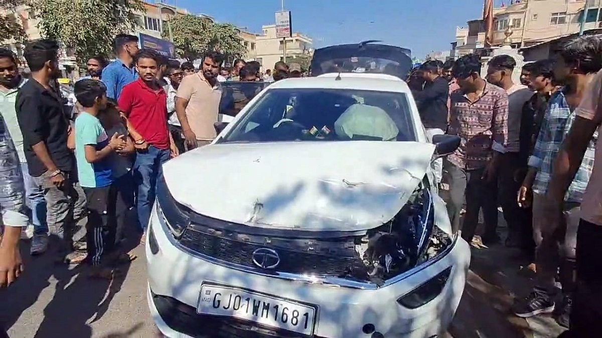 अहमदाबाद के चांदखेडा इलाके में टेम्पो को टक्कर मारने के चलते क्षतिग्रस्त कार। उसे घेरे खड़े लोग।