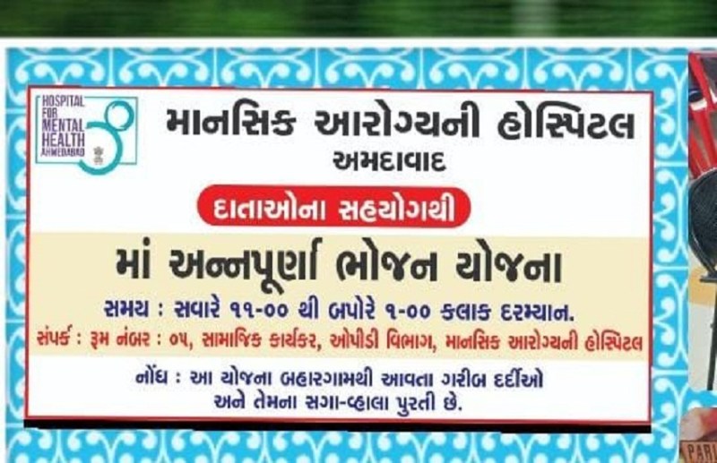 अहमदाबाद के मेंटल अस्पताल में न सिर्फ राज्य के बल्कि पड़ौसी राज्यों के मरीज भी उपचार के लिए आते हैं। ऐसे में दानदाताओं की ओर से अस्पताल में ही मां अन्नपूर्णा भोजन योजना के नाम से जरूरतमंद मरीज और उनके परिजनों को निशुल्क भोजन की व्यवस्था की गई है।दूर-दूर से आने वाले मरीज और उनके परिजनों को भोजन कराया जाता है। अस्पताल में नियमित कुछ दानदाताओं और अस्पताल के सामाजिक कार्यकर्ता विभाग की ओर से यह आयोजन किया जाता है। अस्पताल के सामाजिक कार्यकर्ता अर्पणभाई नायक के अनुसार राज्य में संभवत: पहला अस्पताल है जहां ओपीडी में आने वाले मरीजों को भी इस तरह लाभ मिलता है। उनके अनुसार अस्पताल में भर्ती रहने वाले मरीजों को सरकार की ओर से हर अस्पताल में भोजन की व्यवस्था होती है, लेकिन ओपीडी और सामान्य तौर पर भर्ती मरीजों के लिए यह विशेष है। इसमें रामश्याम चेरीटेबल ट्रस्ट की मंजूबेन अग्रवाल के अलावा दानदाता पारसमल लूणावत, धरमचंदर दमाणी, कृष्णाबेन अग्रवाल, महेन्द्र खटनानी, कुणाल खटनानी, गौतम बोहरा एवं कपड़ा मार्केट्स के व्यवारी भी सहयोग कर रहे हैं।