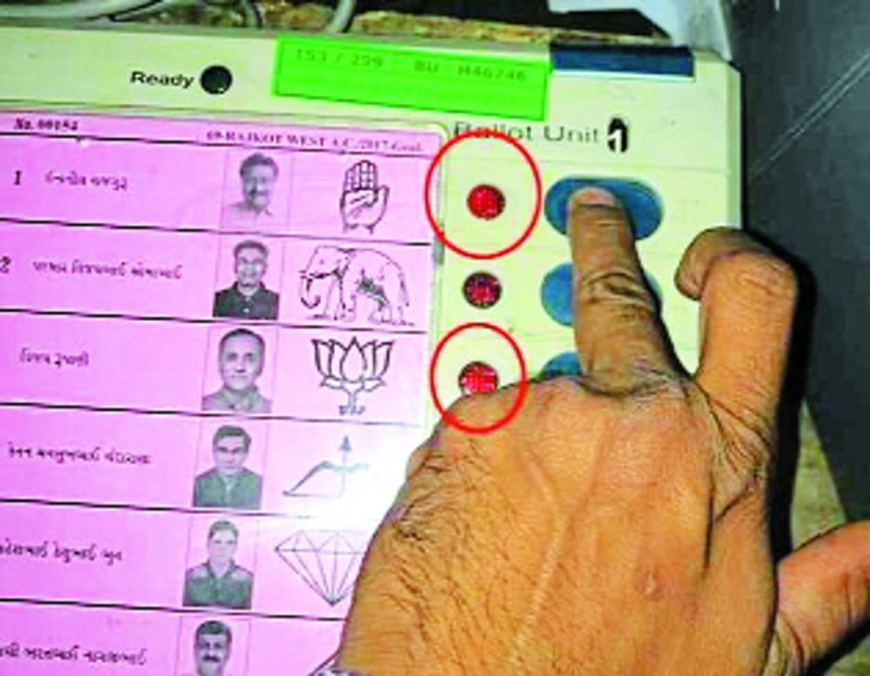 शहर कांग्रेस के कार्यकारी अध्यक्ष महेश राजपूत ने आरोप लगाया है कि ईवीएम में इन्द्रनील का बटन दवाया तो उसके साथ ही विजय रुपाणी के बटन व अन्य एक के बटन पर लाइट जली है। इस संबंध में परिवेक्षक अश्विनीकुमार को लिखित में शिकायत की गई है। शिकायत में बताया गया है कि अलग-अलग मतदान केन्द्रों के अनेक बूथों पर वाईफाई डायरेक्ट कनेक्ट होता है और अलग-अलग स्थलों पर वाईफाई में यूजरनेम एक जैसा आता है।
