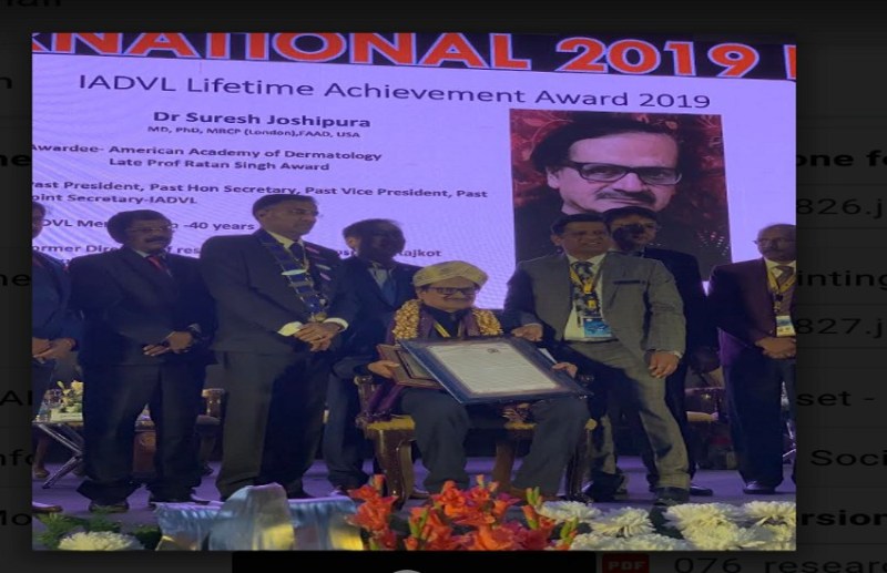 राजकोट. इंडियन एसोसिएशन ऑफ डेरमेटोलॉजिस्ट वेनेरियोलॉजिस्ट एंड लेप्रोलॉजिस्ट (आईएडीवीएल) की इंटरनेशनल कॉन्फे्रन्स डेरमांकोन में डॉ. सुरेश जोशीपुरा को लाइफ टाइम अचीवमेंट अवार्ड से सम्मानित किया गया।