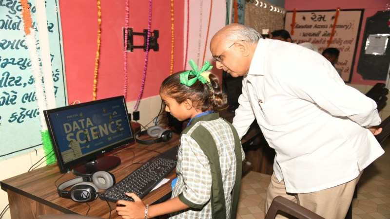 सुरेन्द्रनगर की एक स्कूल में मुख्यमंत्री भूपेन्द्र पटेल छात्रा को कम्प्यूटर की जानकारी देते हुए।