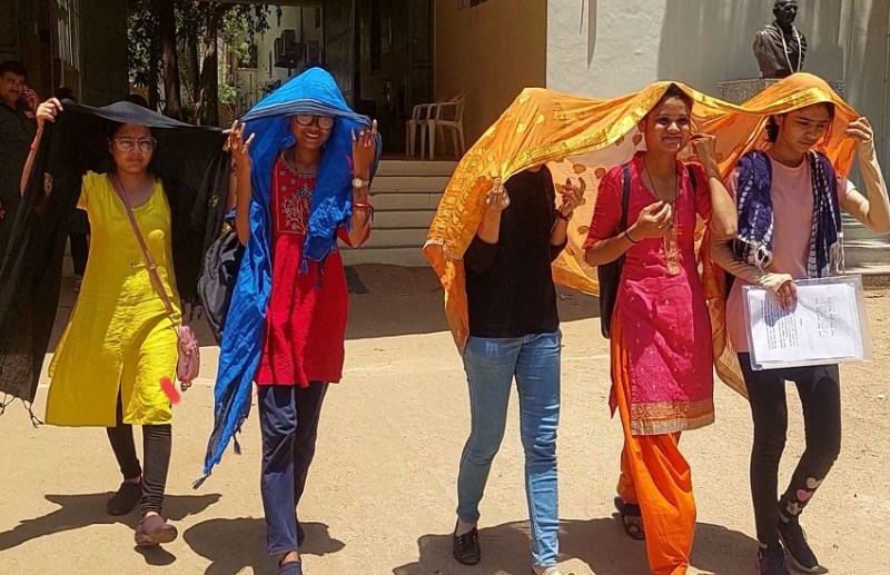 आणंद में कॉलेज से लौट रही छात्राओं ने भी कॉलेज कैंपस में सिर ढंककर भीषण गर्मी में ठंडक पाने की कोशिश की।