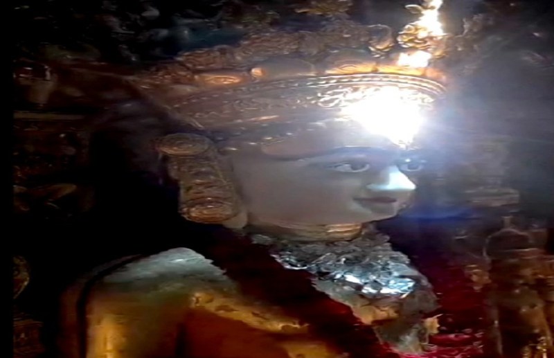 गांधीनगर में कोबा स्थित महावीर जैन आराधना केन्द्र में महावीरालय जिनप्रसाद के शिखर से मूलनायक महावीर स्वामी की प्रतिमा के ललाट पर शुक्रवार दोपहर में देदीप्यमान सूर्यकिरण।