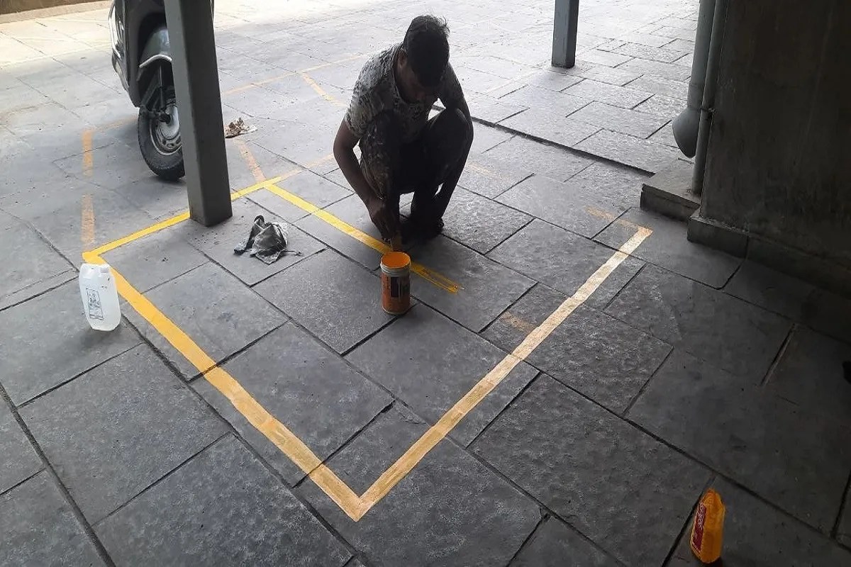अहमदाबाद शहर के नवरंगपुरा क्षेत्र की एक इमारत में वाहन पार्किंग के लिए पट्टा बनाता कारीगर।