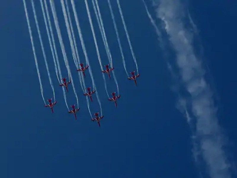 लगभग 15 मिनट तक एयरफोर्स के ये विमान अहमदाबाद के आसमान में करतब दिखाते नजर आए। इस दौरान स्टेडियम में मौजूद क्रिकेट फैंस का जोश देखने लायक रहा। इंडियन एयरफोर्स(Indian airforce) की सूर्यकिरण एरोबेटिक्स टीम ने यह एयर शो परफॉर्म किया। इस दौरान इस टीम के 9 विमान अहमदाबाद के नरेंद्र मोदी स्टेडियम के ऊपर से गुजरते दिखे। इस फ्लीट में हॉक एमके-132 और किरण MKII विमान शामिल हुए।