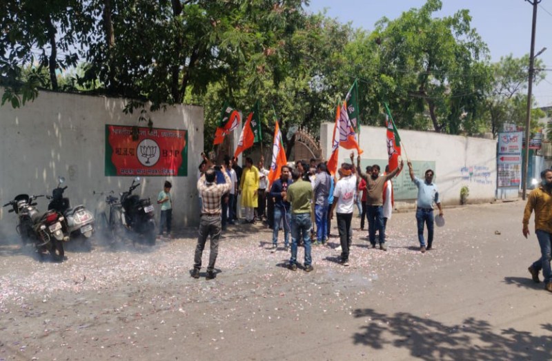 बढ़त से भाजपा कार्यकर्ताओं में जश्न, छत्तीसगढ़ दफ्तर में बांटी मिठाईयां, फोड़े पटाखे