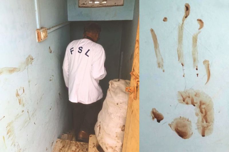 घटनास्थल से साक्ष्य जुटाती एफएसएल की टीम और दीवार पर खून से छपा हाथ (फोटो: पत्रिका)