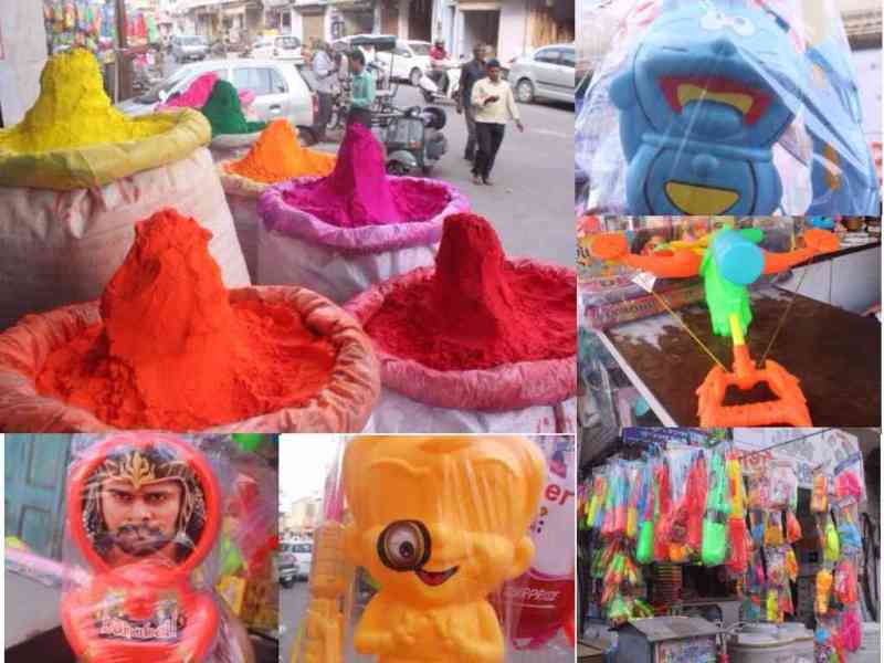 रंगों के त्यौहार होली के करीब आने के साथ बाजार रंगों और पिचकारियों की दुकानें सजने लग गई है। बाजार में भिन्न-भिन्न तरह के रंग और पिचकारियां बच्चों को लुभाने के लिए तैयार है। इस बार रंग बरसाने वाला पटाखा एक दम नया है। इससे लोगों की होली पर पटाखे जलाने की इच्छा भी पूरी हो जाएगी। पिचकारियों मेंं बच्चों के लिए बाहुबली की पिचकारी नया आकर्षण है। बाहुबली का धनुष भी खूब लुभा रहा है। छोटा भीम और डोरेमॉन भी पिचारियों के रूप में बच्चों पर फुहार करने के लिए तैयार है