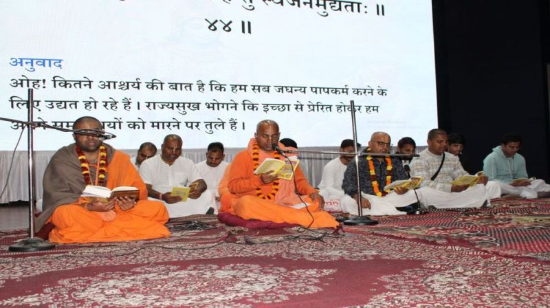 अंतरराष्ट्रीय कृष्ण भावनामृत संघ (इस्कॉन) अजमेर की ओर से राजस्थान माध्यमिक शिक्षा बोर्ड सभागार में शनिवार को गीता जयंती महोत्सव मनाया गया। कार्यक्रम के प्रारंभ में हरे कृष्णा हरे रामा संकीर्तन किया गया। चैतन्य चरण प्रभु ने बताया कि श्रीमद भगवत गीता की शिक्षाओं को दैनिक जीवन में अपनाकर व्यक्ति समस्त प्रकार के दुर्गुणों से मुक्त हो जाता है। भगवत गीता सभी ग्रंथों का सार है। इस मौके पर गीता ध्यानम व गीता महात्म्य से प्रारंभ हुआ। सैकड़ों भक्तों ने एकसाथ संपूर्ण भगवद्गीता के अठारह अध्यायों का करीब 3 घंटे पाठ किया। श्यामानंद प्रभु ने भगवत गीता का महात्म्य एवं गीता आधुनिक जीवन में प्रासंगिकता की जानकारी दी। इस अवसर पर इस्कॉन भक्तों ने भगवान के भजनों पर कई गीत गाएं। पूरा सभागार संकीर्तन से गूंज उठा। राधा माधव की आरती में भक्तों ने उत्साहपूर्वक शिरकत की।