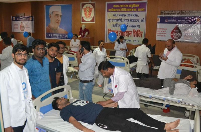 जवाहर लाल नेहरू मेडिकल कॉलेज में रक्तदान शिविर में नर्सिंक स्कूल के छात्र-छात्राओं की ओर से भी रक्तदान किया गया। प्रिसंपील डॉ. सिंह ने कहा कि रक्तदान महादान है। रक्तदान से सड़क दुर्घटनाओं में घायलों की जान बचती है। रक्त किसी फैक्ट्री में नहीं बनता है। इसके लिए रक्तदान करना आवश्यक है। इस मौके पर डॉ. एस.के. भास्कर, डॉ. अनिल जैन, डॉ. श्याम भूतड़ा, डॉ. अजमेरा सहित कई डॉक्टर उपस्थित रहे।