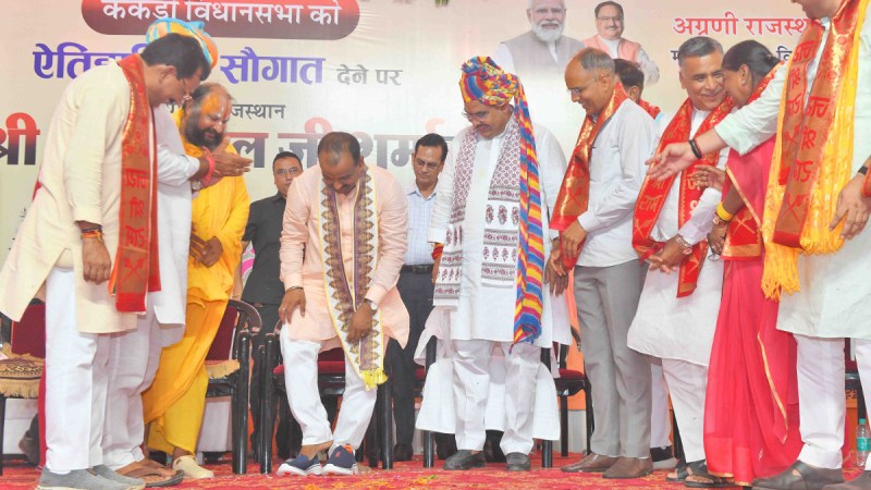 मुख्यमंत्री सोमवार को केकड़ी के कृषि मंडी प्रांगण में परिवर्तित बजट वर्ष 2024-25 में जिले को मिली सौगातों के लिए आयोजित धन्यवाद सम्मेलन को संबोधित कर रहे थे। वहीं विधायक शत्रुघ्न गौतम की प्रतिज्ञा पूर्ण होने पर सात माह बाद सोमवार को सीएम भजनलाल शर्मा जयपुर से उनके लिए पदवेश साथ लेकर आए। जिन्हें सब की मौजूदगी में गौतम ने धारण किए।