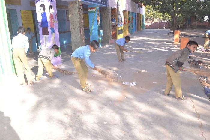 निकटवर्ती नया गांव के राजकीय उच्च प्राथमिक विद्यालय में बच्चे स्कूल में झाडू लगा रहे हैं। बच्चे स्कूल में आते ही झाडू लेकर विद्यालय के कमरों, बरामदा आदि की साफ -सफाई करते हैं।