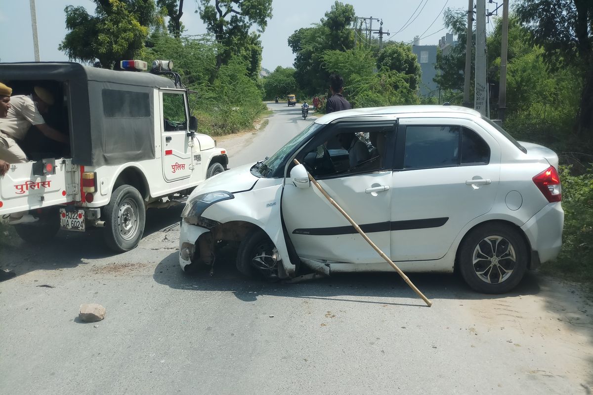 सीमेंट ब्लॉक से टकराकर क्षतिग्रस्त हुई कार।