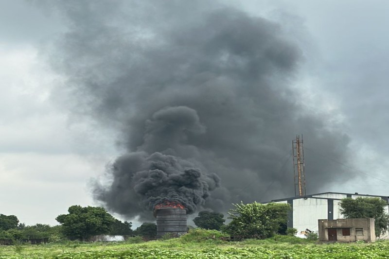 टायर फैक्ट्री के टैंक में आग के दौरान उठता धुएं का गुबार। फोटो- पत्रिका