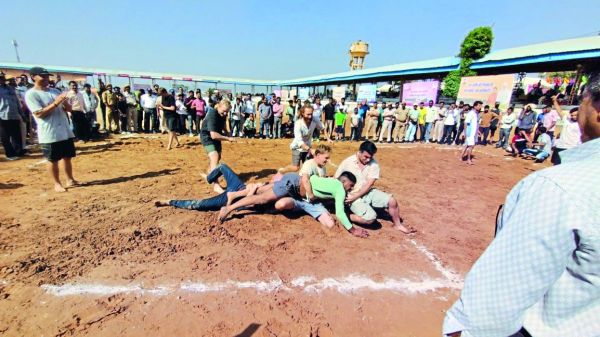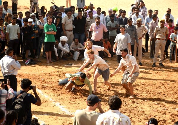 पुष्कर के धोरों में कबड्डी प्रतियोगिता में हिस्सा लेते स्थानीय युवक व विदेशी सैलानी।