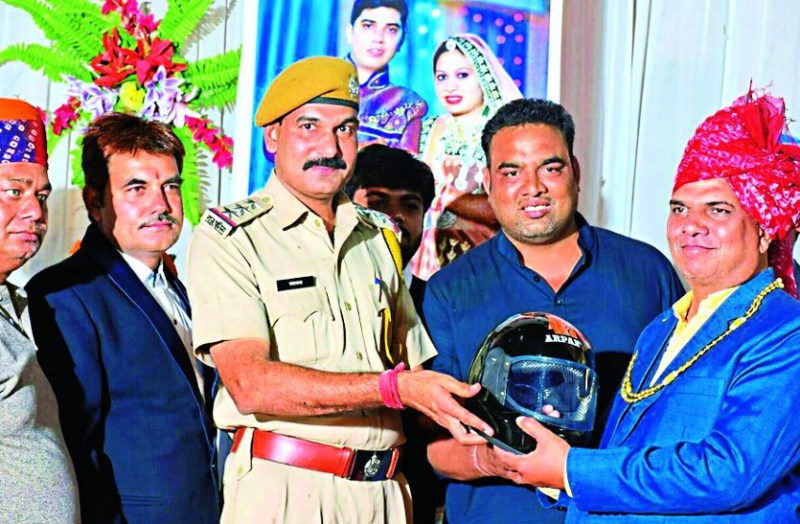 शहर थानाधिकारी यशवंतसिंह यादव के उपस्थिति में बारातियों को हेलमेट उपहार स्वरूप दिए। इस मौके पर उन्होंने कहा कि इस पहल के जरिए यह संदेश देने का प्रयास किया गया कि जीवन अनमोल है। वाहन चलाते समय हेलमेट का उपयोग करे। इस मौके पर पार्षद नरेश कनोजिया, रमेशचन्द्र, सुनील पालरिया, किशन पालरिया, दिलीप, संजय, कुलदीप दगदी, मोहित दगदी, खुशवंत तंवर सहित अन्य उपस्थित थे।