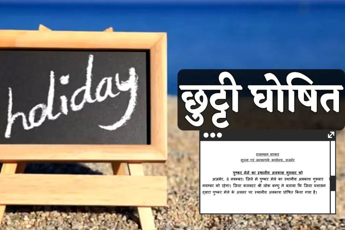 Pushkar Mela 2024 Holiday: राजस्थान के अजमेर जिले में प्रसिद्ध पुष्कर मेले का स्थानीय अवकाश के लिए जिला कलक्टर ने आदेश जारी किया है। जिसमें जिला कलक्टर लोक बन्धु ने बताया कि जिला प्रशासन द्वारा गुरूवार 14 नवंबर को पुष्कर मेले के अवसर पर स्थानीय अवकाश घोषित किया गया है। स्थानीय अवकाश के कारण उस दिन सरकारी स्कूल और कार्यालय बंद रहेंगे।