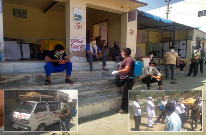 गढ़ी मालियान मुक्तिधाम में अंत्येष्टि करने आए लोगों तथा शव वाहन को भी किया जाता है सेनिटाइज।