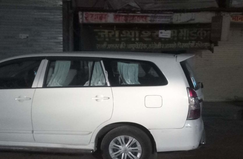 नसीराबाद में दवा विक्रेता की दुकान के बाहर खड़ी नारकोटिक्स विभाग के अधिकारियों का वाहन।