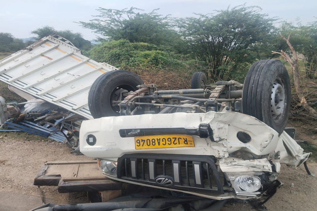 नसीराबाद-ब्यावर राजमार्ग पर सड़क दुर्घटना में क्षतिग्रस्त पिकअप वाहन।