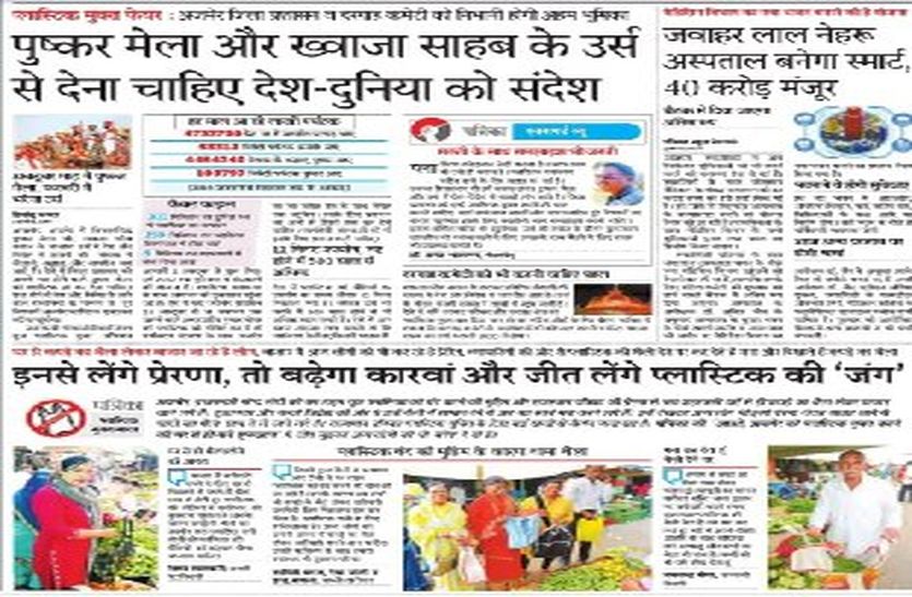 राजस्थान पत्रिका की ओर से वन टाइम यूज प्लास्टिक को बंद करने की मुहिम के तहत शृंखलाबद्ध समाचारों का प्रकाशन किया गया। राजस्थान पत्रिका ने 26 अक्टूबर के अंक में ‘पुष्कर मेला और ख्वाजा साहब के उर्स से देना चाहिए देश-दुनिया को संदेश’ शीर्षक से समाचार प्रकाशित किया। इसमें बताया कि अजमेर में विश्व प्रसिद्ध पुष्कर मेला और ख्वाजा गरीब नवाज के सालाना उर्स से देश और विदेश से बड़ी संख्या में सैलानी, श्रद्धालु और जायरीन यहां आते हैं। ऐसे में जिला प्रशासन पुष्कर मेले को प्लास्टिक मुक्त कर देश-दुनिया में संदेश दे सकता है। जिला प्रशासन ने मंगलवार को पुष्कर मेले को प्लास्टिक मुक्त करने की घोषणा की।