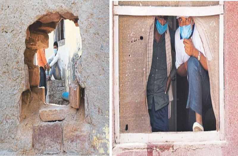 धौलपुर के राजकीय जिला अस्पताल में बनाए क् वारंटाइन सेंटर की तोड़ी दीवार व खिडक़ी की टूटी रेलिंग व शीशे से देखते चिकित्साकर्मी।