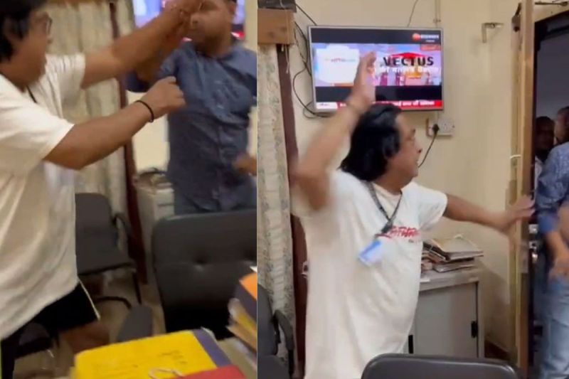 शैक्षिक विभाग के अनुभाग अधिकारी राजेश टेकचंदानी सोमवार को टी-शर्ट और बरमूड़े में ही कार्यालय पहुंच गया। निदेशक (शैक्षिक) राकेश स्वामी के कक्ष में वार्ता के दौरान अचानक टेकचंदानी आग बबूला हो गया। उसने कक्ष में हंगामा कर दिया। इस दौरान एक कार्मिक पर हाथ उठाने का प्रयास किया तो अन्य कर्मचारियों ने बीच-बचाव किया। टेकचंदानी ने कथित तौर पर अभद्र भाषा का प्रयोग किया। इसके बाद उसने बोर्ड सचिव के पीए कक्ष में भी शोर मचाया।