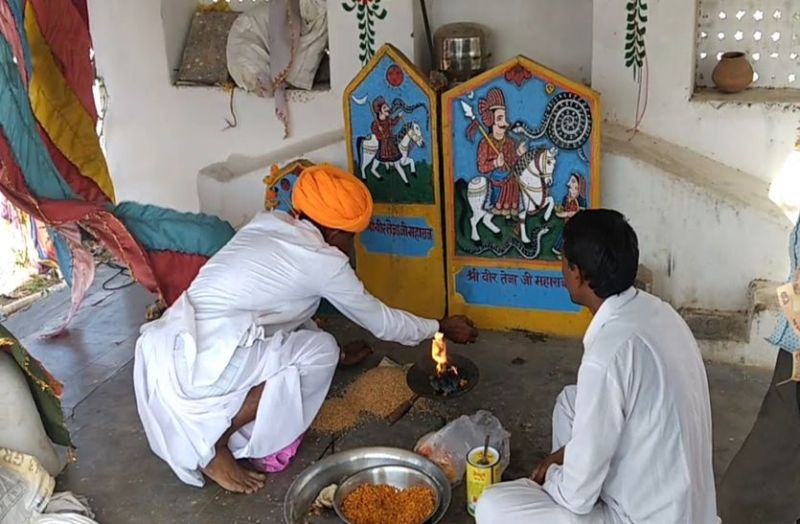 इसी तरह घूघरा, गगवाना, गेगल, लाडपुरा, कांकरदा भूणाबाय, कायड़, लोहागल, परबतपुरा, माकड़वाली, होकरा, कानस, फायसागर रोड, शास्त्री नगर और अन्य इलाकों में तेजाजी के थान पर सिर्फ पूजन का दौर जारी है।