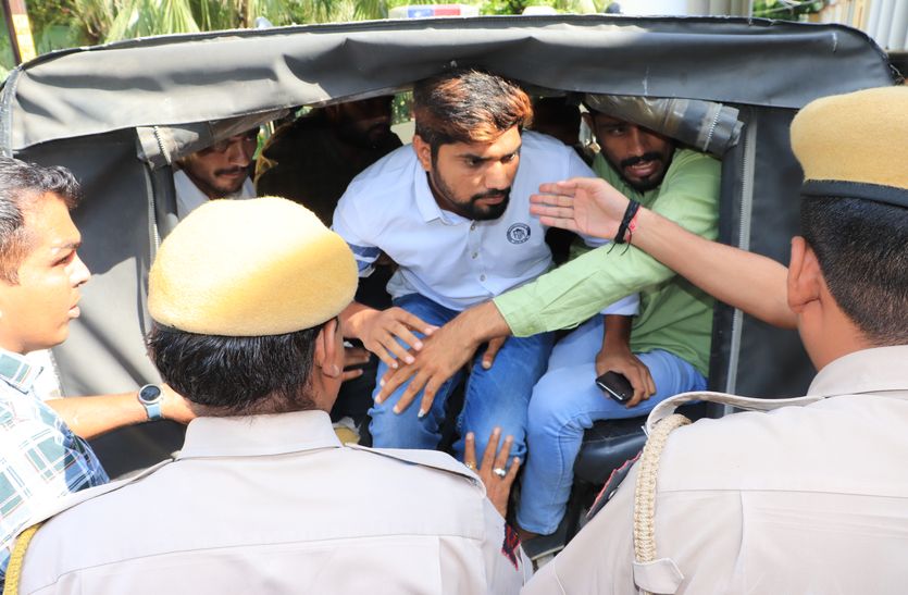 अजमेर में छात्र नेताओं को पकड़ कर ले जाती पुलिस।