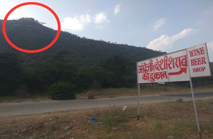 पुष्कर परिक्रमा मार्ग नाला क्षेत्र में सावित्री माता मंदिर पहाड़ी की तलहटी। यहां ठीक माता मंदिर के सामने एक रिसोर्ट की चार दीवारी में शराब का ठेका संचालित है।
