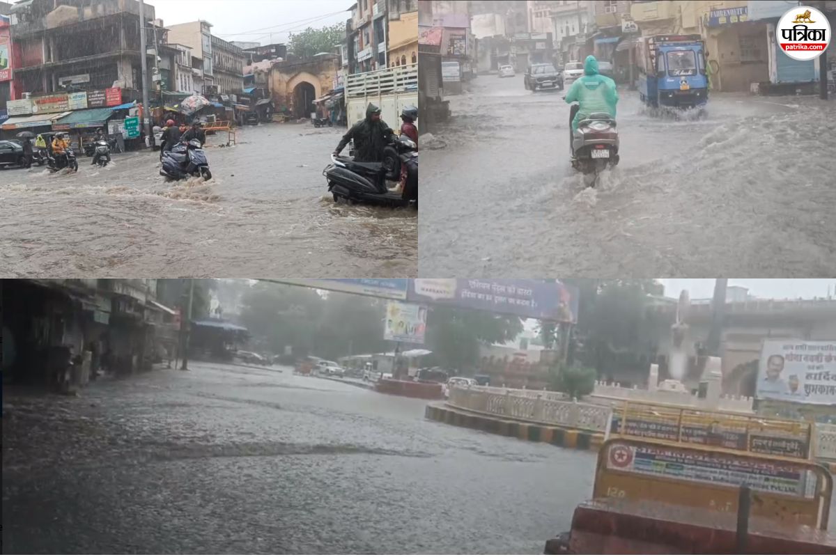 अजमेर। रविवार सुबह अजमेर शहर में हुई तेज बारिश ने जनजीवन को खासा प्रभावित कर दिया। सुबह हल्की बूंदाबांदी के साथ शुरू हुआ मौसम अचानक तेज बारिश में बदल गया। करीब एक घंटे की तेज बरसात के बाद शहर की मुख्य सड़कें जलमग्न हो गईं। गंज, महावीर सर्कल, मदार गेट और रेलवे स्टेशन मार्टिंडल ब्रिज के नीचे भारी जलभराव देखने को मिला। कई जगहों पर पानी का स्तर इतना बढ़ गया कि दोपहिया वाहन और राहगीरों को निकलने में परेशानी हुई।